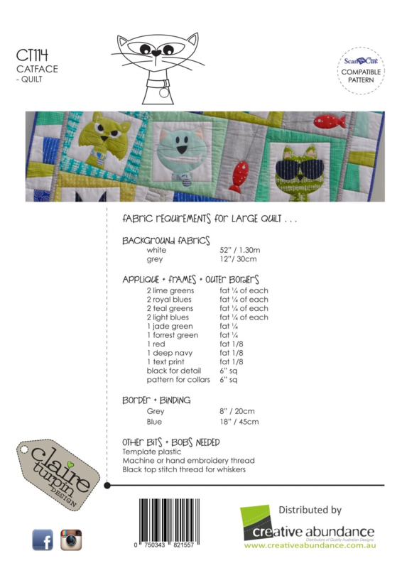 Het quiltpatroon Catface Applique van Claire Turpin Designs bevat veel verschillende kattengezichtjes.