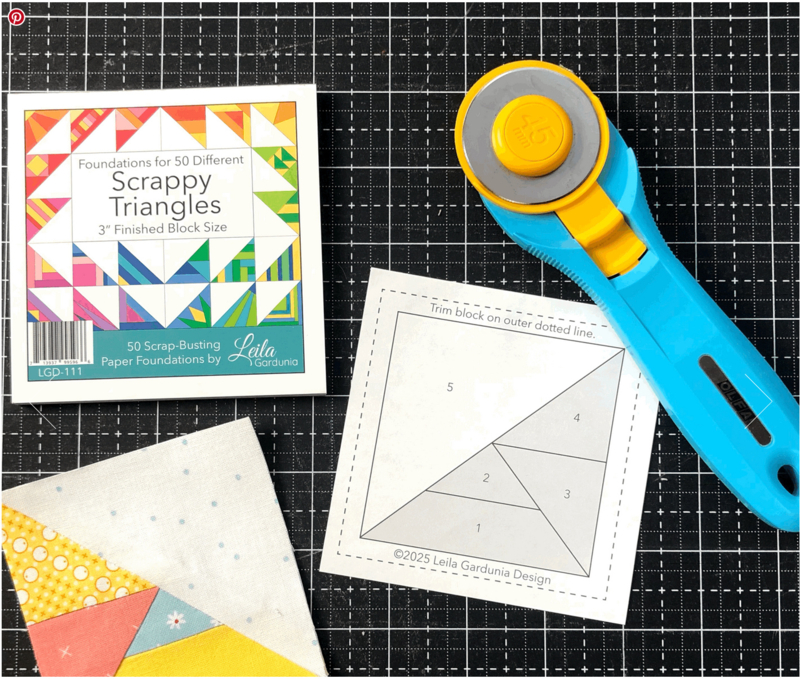Het 7,5 cm (3 inch) Scrappy Triangles-basisblok bevat: 25